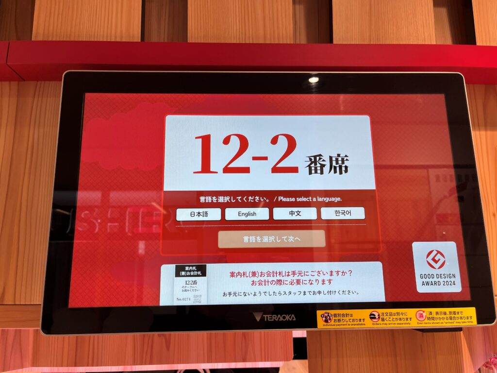 お店に入ると、まずは席の発券をします。カウンター席かテーブル席を選び、人数を入力して受付を済ませる流れでした。